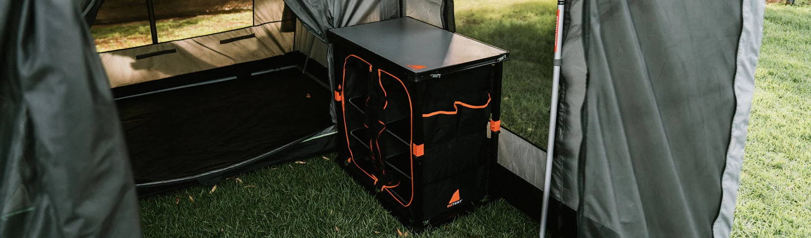Introducing the OZTENT Double Camper Cupboard! Building on the ever popular OZTENT Camper Cupboard – the Double Camper Cupboard features easy setup and pack down, 2 storage areas with 3 shelves each, extra large side pockets, a laminated aluminium resin bench top and it all packs down to a flat pack size which is perfect for your next camping adventure.